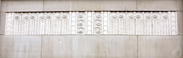 This building has long ceased to be a central Vancouver branch of the Bank of Nova Scotia at 1196 Davie Street, however it has some fine, abstract plant motifs on its exterior. Designed by the firm of Sharp and Thompson as a fairly standard stone faced bank with neo-Classical lines, the Art Deco touches lighten it a bit. It was constructed in 1929.
