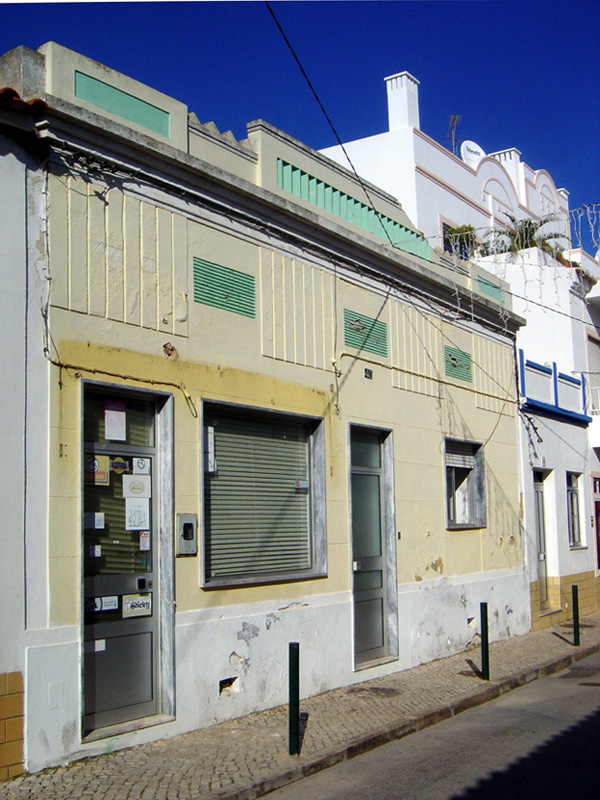 The picturesque seaside town of Alvor in southern Portugal has a number of Art Deco buildings. Though modest in scale they are often quite colourful such as this one with its mix of yellows and greens. The parapet’s green, pleated centre stands out.