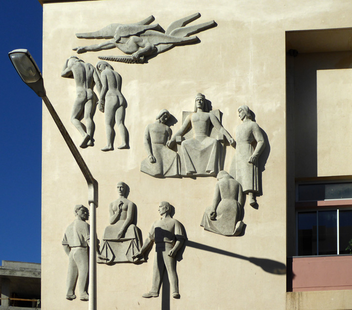 This is the Tribunal Judicial da Comarca de Faro – Secção Central, or the County Courthouse of Faro, Central Section. It is located at Avenida 5 de Outubro 10, in Faro, the capital of the Algarve region at the south of Portugal. The sculptures show a sequence from divine justice, with Adam and Eve expelled from the Garden of Eden, then a King dispensing justice from his court, to modern law with a claimant and a respondent in front of the symbol of justice.