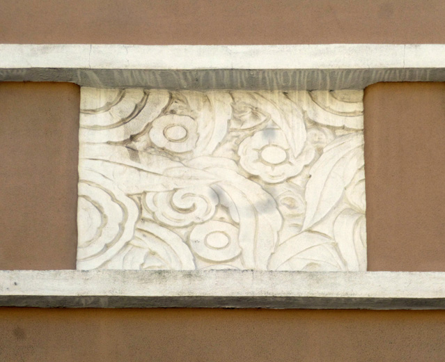 Flower arrangement above the main entrance.More carved flowers and leaves.