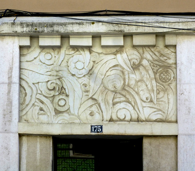 Here is a six storey apartment block located at Rua do Salitre 175 in the Rato district of central Lisbon. Its key colours are brown and white, and it has angular bay window towers rising from the third to fifth floors. Another feature is the carved, stone relief panels of flower arrangements which give a nod to the French designers who evolved them. These can be seen above the central entrance then between the windows on the floors above.