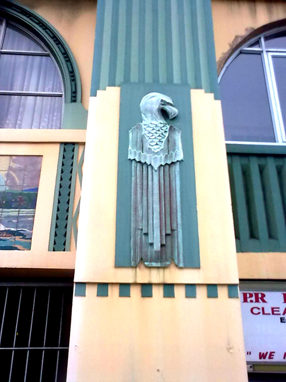 Situated at 124 Margaret Mncadi Avenue, Durban’s 1933 Victoria Mansions were designed by E S Cornelius. Victoria Mansions is an apartment building facing the bay across the Victoria Embankment. It has vertical pilasters with fluting which rise through an arcuated first floor. The facade is richly decorated with geometric patterns and an array of fantastical animal figures. Apart from dolphins and winged lions, it also has a vulture feature on the side panel of the entrance. The glazed tile panel over the entrance is a nostalgic memento of the days of the great Union Castle mail ships that called at Durban for so many years.