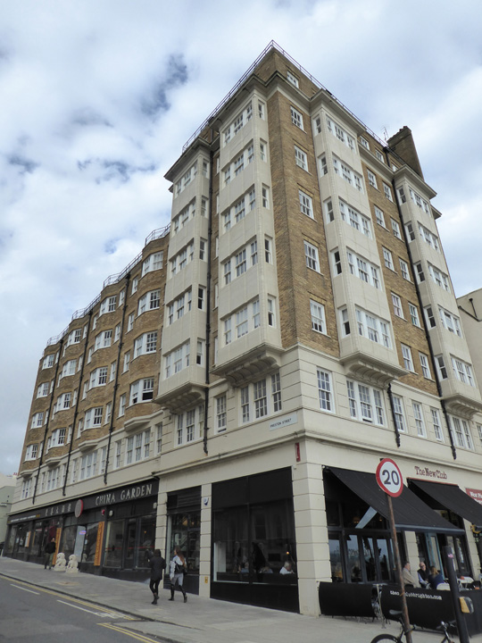 Constructed for International Stores in 1935, Mitre House In Brighton was designed by J. Stanley Beard & Bennett. Located in Western Road, it is mixed use with shops below and a six-storey block of flats above. As with many apartment blocks in England from this time there is a fine interplay between the brick and stone facings. The balconies are all faced with stone and rise from the second floor.