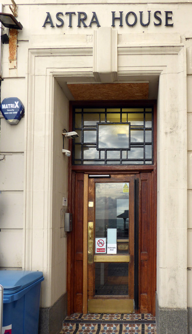 Brighton Art Deco apartment block Astra House was completed in 1938. It is tall for a UK seaside building at ten storeys high, with 61 flats rising above a ground floor of retail premises. The top two storeys step back and are thus less visible. It has continuous bay windows from the second to sixth floors.